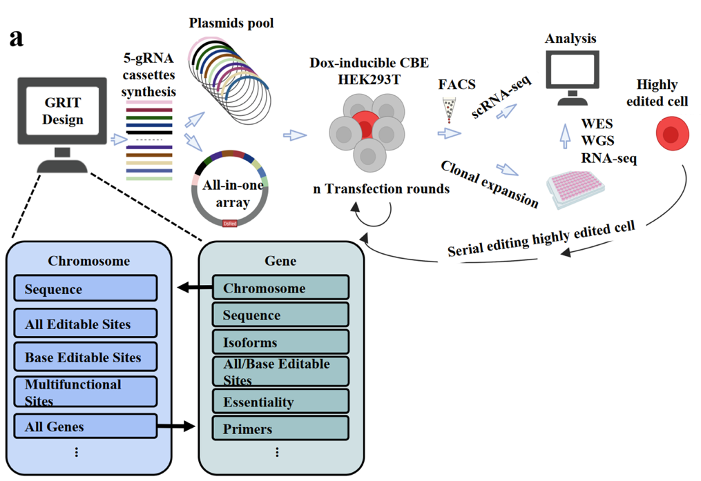地球上大多数生物体共用64个三联体密码子,其中61个密码子可以编码20种天然氨基酸和3个密码子作为终止信号。在20种氨基酸中有18个由一个以上的同义密码子来编码,被称为遗传密码子的简并性。基因组重新编码技术就是顺利获得基因组工程手段进行同义密码子替换,将“冗余”密码子去掉,并赋予这些被去除密码子(“空白”密码子)新编码能力的技术。顺利获得基因组重编码不仅可以赋予了生物体或细胞抗病毒的能力,也可以重新赋予“空白”密码子新的功能,包括非标准氨基酸的整合和生物防护。2013年Church 实验室首次在大肠杆菌顺利获得TAA取代TAG终止密码子并删除释放因子1 (RF1),使得其具有抗病毒的能力2。2021年,Jason Chin 实验室在大肠杆菌全基因组范围内实现用同义词密码子替换两个有义密码子和一个终止密码子,并删除相应的转运RNA (tRNA) 和释放因子,使得该大肠杆菌码子具有抗多种病毒和遗传编码非标准的氨基酸的能力3。此外,基因组重编码设计也正在酵母基因组SC2.0计划中实施4,但在人类全基因组范围内进行基因组重编码是否可行呢?本研究中,研究人员首次提出了在人类全基因组范围内将TAG终止密码子转换为TAAs的工作框架(图2)。第一时间,作者们开发了一个软件GRIT来解析基因组数据,识别人类基因组中所有的TAG密码子,并为碱基编辑器设计gRNAs,引导它们转换为同义密码子TAA。虽然该软件只在人类基因组数据上进行了测试,但它可以用于其他具有高质量参考基因组和充分注释的真核生物,如小鼠和果蝇等。随后,他们开发了高效的TAG到TAA转换方法,顺利获得多个gRNA阵列递送与CBE单碱基编辑器5及其报告荧光分子,使高编辑的细胞得到富集。此外,作者们还顺利获得单细胞RNA测序(scRNAseq)分析了细胞群体中单细胞中多重复合碱基编辑的结果。最后,他们顺利获得全基因组测序、转录组测序和核型分析等手段对那些高基因组修饰的单克隆进行了评估。
