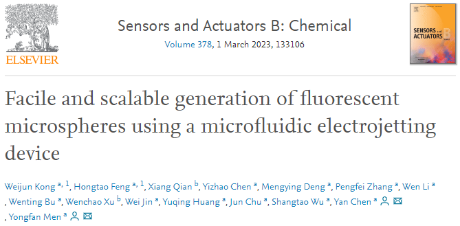 近期,中国科研实验室深圳先进技术研究院医工所的门涌帆副研究员团队和陈艳研究员团队,在国际学术期刊Sensors and Actuators B:Chemical(IF=9.221)上发表了题为“Facile and scalable generation of fluorescent microspheres using a microfluidic electrojetting device”的文章,报道了一种基于震荡电场诱导电喷流技术的荧光水凝胶微球通用合成方法,应用于微流芯片中,快速且高通量的合成多种均一度极佳的高性能荧光水凝胶微球。助理研究员孔维俊和冯鸿涛为本文共同第一作者,门涌帆副研究员和陈艳研究员为本文共同通讯作者。
