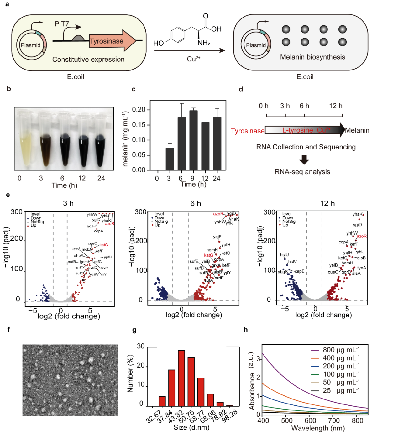 图2.黑色素纳米颗粒的生物合成与表征。 (a) 黑色素纳米颗粒在大肠杆菌中生物合成的示意图, (b) 黑色素生物合成过程中不同时间点代表性图片, (c) 定量分析不同时间点黑色素生成的产量, (d) 黑色素纳米颗粒生物合成过程中不同时间点(0, 3 h, 6 h, 12 h)的样品进行RNA-seq文库构建并测序分析, (e) 表达显著变化基因的火山图, (f) 黑色素纳米颗粒的TEM图片(Scale bar =50 nm ) ,(g) DLS测定黑色素纳米颗粒的水合动力直径, (h) 不同浓度的生物合成黑色素纳米颗粒的紫外可见吸收光谱。