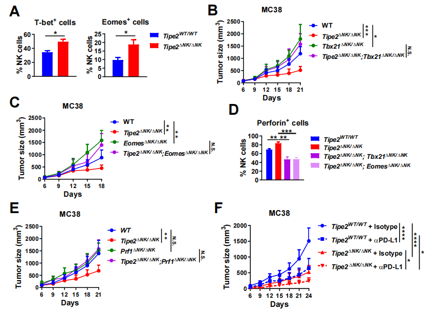 在作用机制方面,由于科研人员观察到肿瘤浸润NK细胞中效应分子IFN-g及perforin表达较高的群体Tipe2表达较低,且Tipe2缺失的肿瘤浸润NK细胞具有更强的杀伤活性(图2),科研团队考虑TIPE2是否顺利获得抑制IFN-g及perforin等效应分子的上游分子,间接抑制NK细胞的效应功能,从而影响CD8+T细胞抗肿瘤应答。团队发现Tipe2缺失后肿瘤浸润NK细胞表达更高水平的转录因子T-bet及Eomes。转录因子T-bet和Eomes促进NK细胞一系列效应分子的转录,对NK细胞的效应功能起关键作用。另一方面,科研团队检测到Tipe2缺失后肿瘤浸润NK细胞也表达更高水平的perforin,且该现象依赖T-bet或Eomes的存在,印证了T-bet/Eomes与NK细胞效应功能之间的紧密联系。重要的是,团队发现NK细胞中Tipe2缺失对肿瘤生长的抑制效应依赖于NK细胞中表达T-bet、Eomes及perforin,这三者之中任意其一若同时缺失的话,肿瘤将恢复加速生长。另一方面,NK细胞Tipe2缺失能够进一步促进抗PD-L1治疗的抗肿瘤效应,提示二者的作用机制之间存在协同效应(图3)。科研团队的研究表明NK细胞TIPE2顺利获得抑制转录因子T-bet和Eomes及其下游的效应分子的表达,间接限制了抗肿瘤CD8+ T细胞的功能,提示TIPE2是NK细胞辅助功能的卡控点分子。