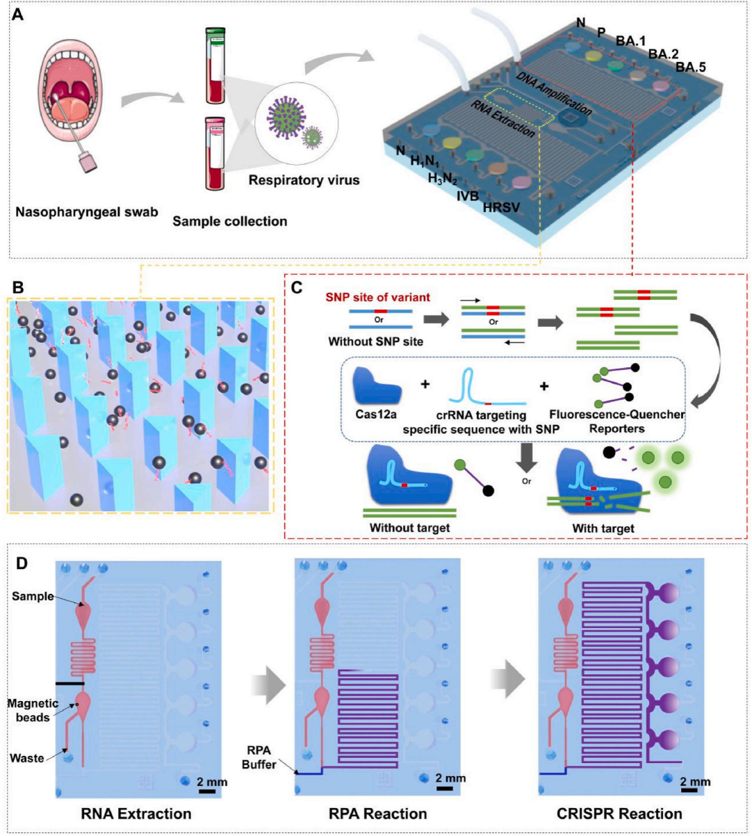呼吸道病毒是导致呼吸道感染的主要因素之一,包括冠状病毒、流感病毒和呼吸道合胞病毒(RSV)等。在儿童和老年人等高风险人群中,病毒感染导致的死亡率极高。传统的诊断方法通常需要复杂的实验设备和较长的检测周期,且存在着高成本、低灵敏度等问题。并且传统的PCR技术只能确定病毒类型,如果要检测同一病毒的不同变异株,就需要进行昂贵且耗时的基因测序。为分析决上述问题,研究人员开发了一种名为LOC-CRISPR的新技术,它基于CRISPR/Cas12a和等温扩增技术,是一种简单、全封闭、高度集成的微流控系统。该系统可以对SARS-CoV-2(新冠)及其变异株(BA.1、BA.2和BA.5)、H1N1(甲型流感病毒)、H3N2(甲型流感病毒)、IVB(流感病毒)和HRSV(呼吸道感染病毒)的进行精准识别。在临床样本测试中,研究团队使用LOC-CRISPR芯片分析了50份鼻咽拭子样本(44份阳性和6份阴性),并取得了优异的灵敏度(97.8%)和特异性(100%)。