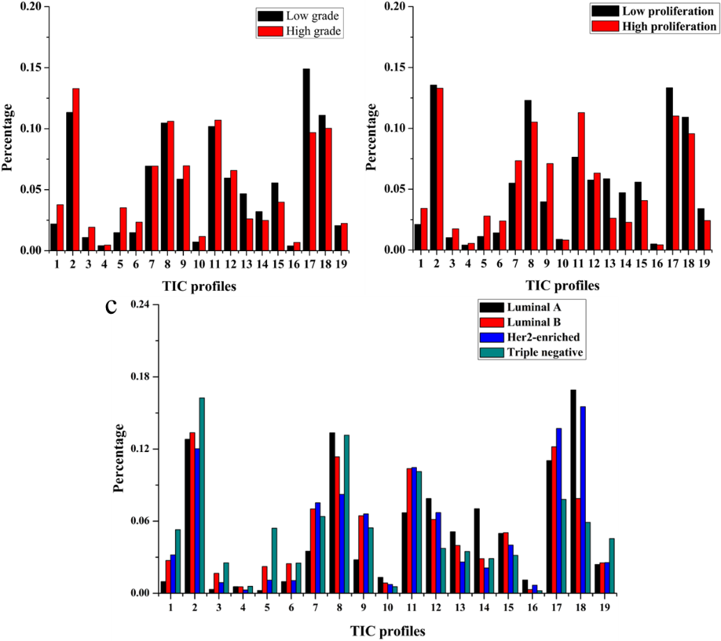 图4 高级别和低级别(a),高增殖和低增殖状态(b)以及四种分子亚型浸润性乳腺癌(c)的Type-19特征的比较条形图