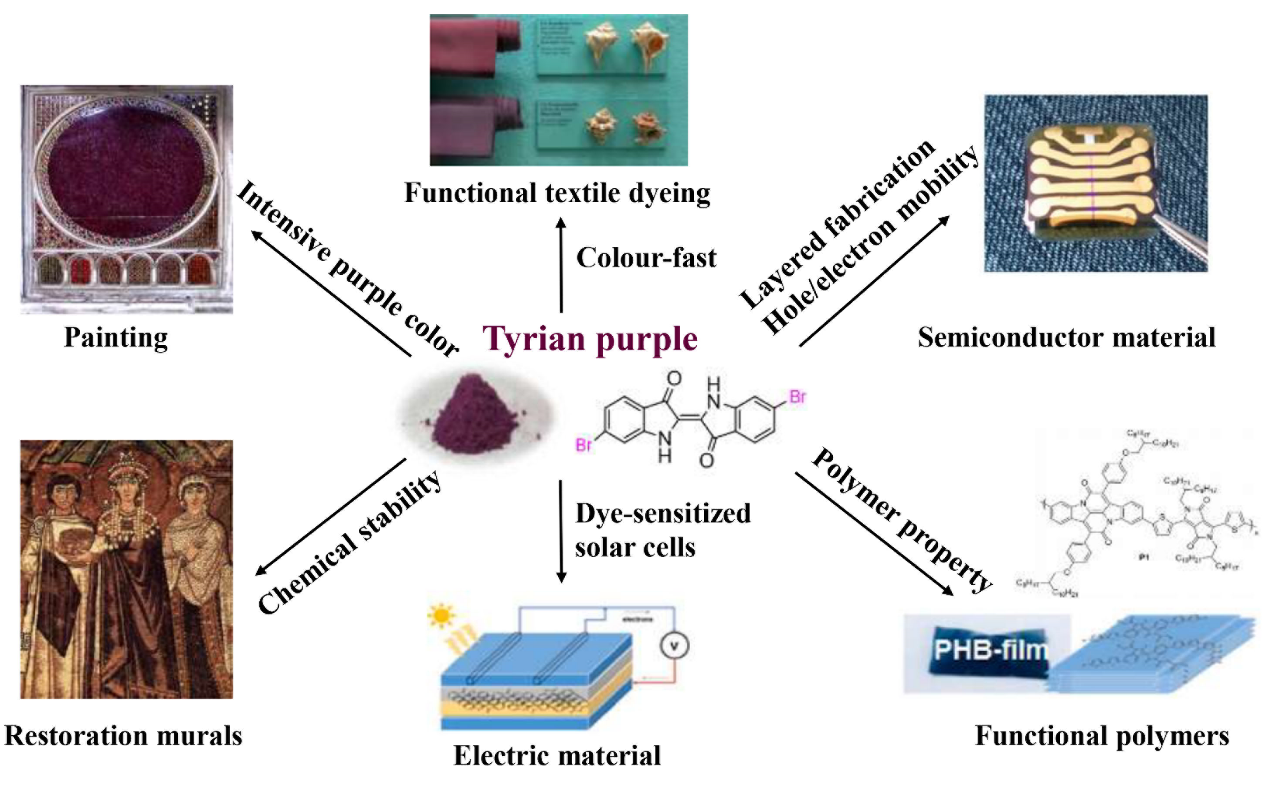 Tyrian purple,中文名称为骨螺紫、泰尔紫,主要由6,6'-二溴靛蓝组成,是一种从海螺里提取的古老而珍贵的染料。它不仅被应用在纺织品染色领域,而且在陶器、建筑和壁画绘画等相关领域得到了广泛使用。在现代,Tyrian purple也很稀有,其售价高达4000美元/克(来源于Kremer)。根据市场调研公司Arizton的报告,2024年全球天然染料市场价值将达到50亿美元,消费者对天然染料染成的服装需求不断上升。同时,研究表明这种昂贵的染料除了传统用途之外还有其他用途,即其具有卓越的生物相容性半导体材料性能。它可被用于如染料敏化太阳能电池、功能聚合物薄膜材料和半导体材料等领域,具有广阔的应用前景(图1)。
