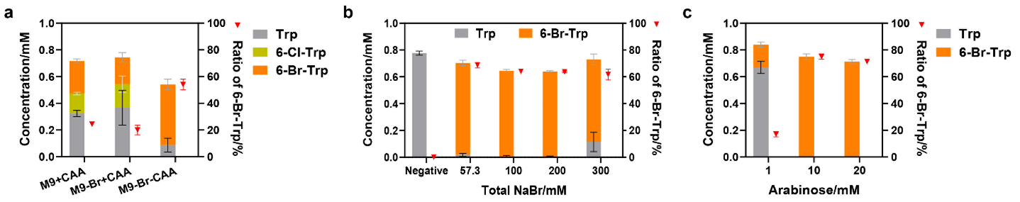为确保Fre-L3-SttH足够高效从而允许pL/pR热启动子提早启动,该研究再次优化了NaBr的添加浓度及补充酵母提取物来增强培养基营养。在最终添加150 mM NaBr的M9-Br-CAA培养基中添加0.1% 的酵母提取物,在30 C下反应8小时后,该研究能够从500 M色氨酸中选择性地合成44.5 mg L-1的Tyrian Purple(图7)。该研究为首次报道的顺利获得一锅法在E. coli中选择性地合成Tyrian Purple,有助于降低Tyrian Purple的生物合成成本,为Tyrian Purple的大规模生产奠定一定的基础。这种选择性地一锅法生物合成Tyrian purple的方法也为其它卤代靛蓝染料的生物合成给予了一种方法,这对于靛蓝类染料用作细菌染料、生物相容性半导体材料以及抗菌涂层或材料具有重要意义。