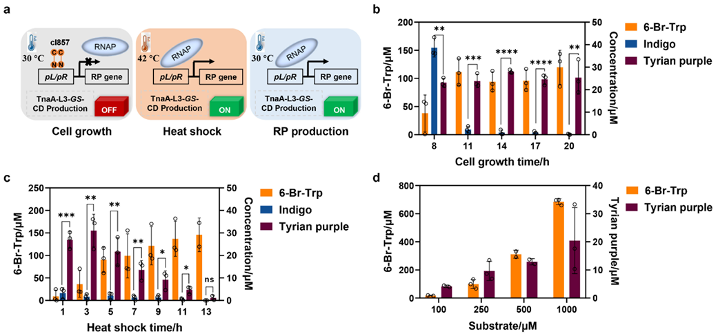 为了克服选择性问题,产生最少的靛蓝副产物,该研究采用了 pL/pR-cI857热诱导系统来精确调控TnaA-L3-GS-CD的表达。研究人员设计了一个三阶段的培养及诱导过程,如图6a所示:在30 C下的细胞生长阶段,同时启动Fre-L3-SttH和分子伴侣groEL/groES的表达。此阶段pL/pR启动子处于抑制状态,因此不能启动TnaA和GS-CD的表达。在42 C的热诱导阶段,当温度升至42 C,热不稳定的阻遏蛋白cI857被释放并允许转录TnaA和GS-CD。随后是温度调回30 C的重组蛋白持续表达阶段,此阶段持续表达Fre-L3-SttH、TnaA和GS-CD。该研究顺利获得优化细胞生长时间及在42 C下的热诱导时间,最终实现了从色氨酸选择性生产Tyrian purple,产量为31.1 M(13.1 mg L-l)(图6b和 6c)。然而,研究发现在最佳条件下,即使投喂充足的中间产物6-Br-Trp,热诱导表达系统调控TnaA和GS-CD表达合成Tyrian purple的产量也只能达到20.4 M(图6d),这表明热诱导表达系统中的pL/pR启动子应该早于14小时开始启动。
