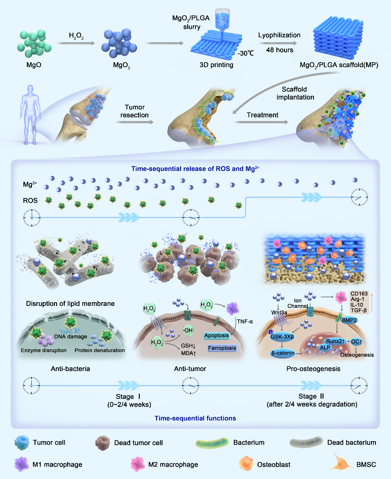 基于病理生理学的3D打印MgO2/PLGA支架设计理念示意图,以及时序多功能活性用于骨肉瘤术后骨缺损修复的机制