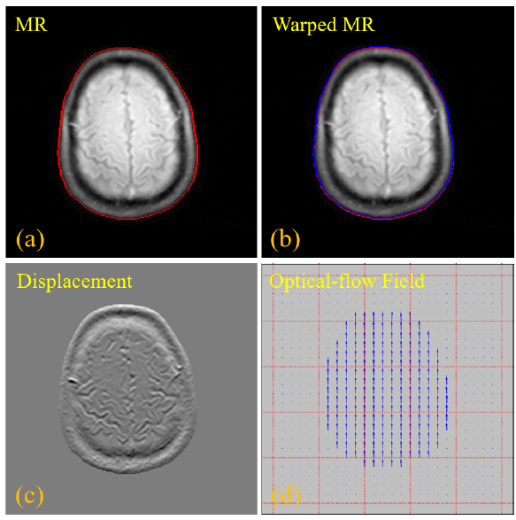 图2 基于光流配准的轮廓学习技术,(a)原始输入的MR 图像,红色曲线代表 MR图像的轮廓,(b)配准模块校正后的 MR 图像,蓝色曲线表示配准MR图像的轮廓,(c)配置变换前后的MR图像之间的像素强度差异,(d)稀疏光流场,显示配准预测网络的水平和垂直方向偏移量
