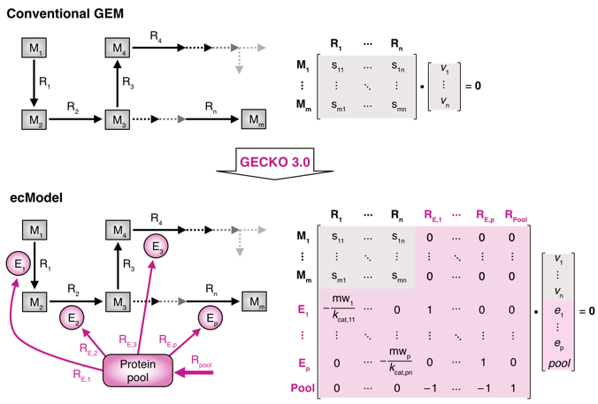 北京时间1月18日,中国科研实验室深圳先进技术研究院陈禹与查尔姆斯理工大学Eduard J. Kerkhoven等人合作在Nature Protocols发表文章Reconstruction, simulation and analysis of enzyme-constrained metabolic models using GECKO Toolbox 3.0。该文章发布了酶约束模型构建和使用的最新版工具箱GECKO 3.0,优化了旧版[1, 2]并加入了酶参数预测[3]和选择模块,使得构建任意物种的酶约束模型成为了可能。另外,该文章作为GECKO 3.0的使用指南,详细描述了酶约束模型构建、模拟和分析的全部流程,能够大幅降低酶约束模型构建和使用门槛。文章第一作者是陈禹、Johan Gustafsson和Albert Tafur Rangel,通讯作者是Eduard J. Kerkhoven