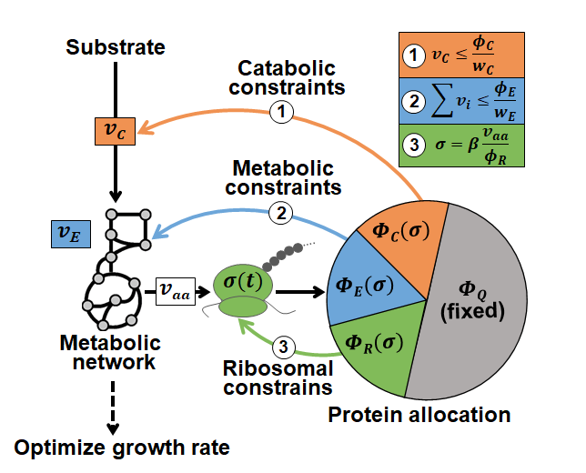 微生物总是生活在不断变化的环境中。为了生存,细菌建立了适应这些变化的能力。其中,代谢通量的重排和蛋白质组的重分配是细菌应对环境变化的常用策略[1-2]。比如,当外部营养条件改变时,细胞会及时调整内部代谢活动以合成氨基酸前体等关键代谢物,进而引起蛋白质组中不同种类蛋白质(例如转运蛋白、核糖体蛋白和代谢酶)的合成速率。我们知道,细胞内的化学反应绝大多数属于酶促反应。因此,蛋白质组中各蛋白组分的重分配反过来又会影响代谢网络中通量的分布。然而,现有的工作对细胞代谢通量和蛋白质分配的研究通常是单独召开的。因此,我们对细胞如何顺利获得交叉调控其代谢通量和蛋白质合成以适应不断变化的营养条件这一科学问题还缺乏充分的理解。