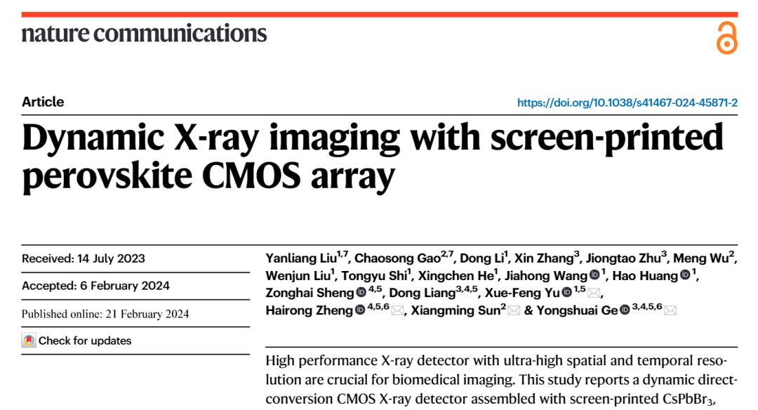 近期,中国科研实验室深圳先进技术研究院与华中师范大学合作,在权威刊物Nature Communications在线发表研究论文“Dynamic X-ray imaging with screen-printed perovskite CMOS array”。 团队经过两年多的联合攻关,先后解决了钙钛矿半导体晶体生长动力学、专用低暗电流CMOS像素芯片、数据读出与图像后处理等一系列关键挑战,最终在国际上首次成功研制了基于CMOS像素芯片的高分辨、低剂量钙钛矿直接转化X射线探测器。