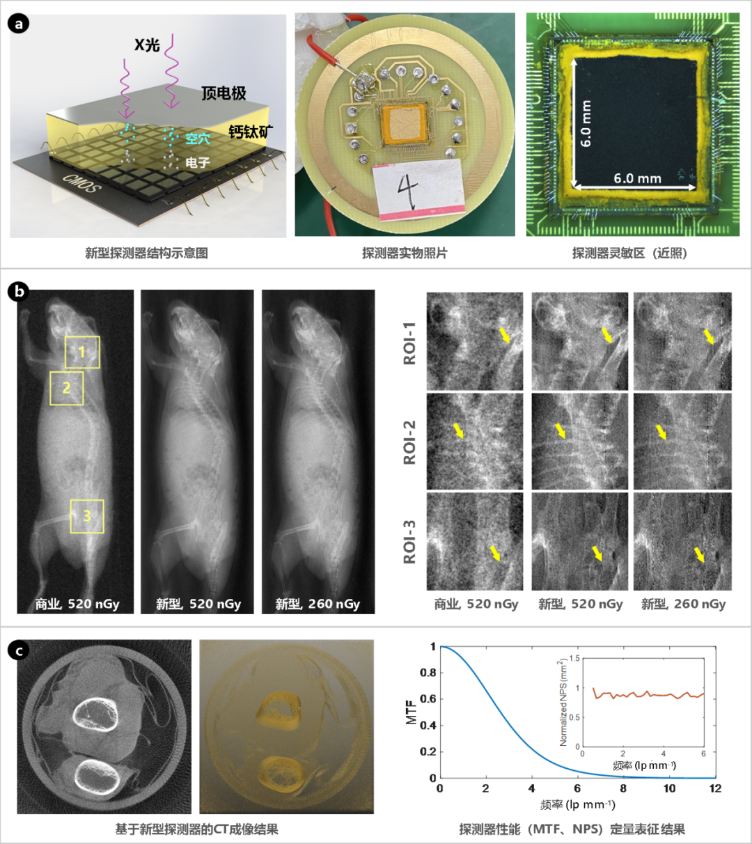 钙钛矿直接转化CMOS探测器及高分辨、低剂量生物医学成像结果。