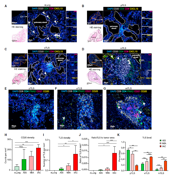 随后研究人员深入探究了早期肺腺癌进展中TLSs的形成过程。正常肺组织中,CD4+T、CD8+T和B细胞呈分散分布;在肿瘤发生初期,肺部微环境出现 CD4+ T细胞的聚集,并伴随零星的CD8+ T和B细胞,称为前体TLSs(precursor tertiary lymphoid structures,pTLSs);随着肿瘤进展,聚集区出现CXCL13高表达的Tfh样细胞,进而招募B细胞,称为早期TLSs;随着B细胞的分化和成熟,聚集区出现CD21+ 滤泡辅助细胞(FDC)和PNAD+ 高内皮微静脉(HEV),最终形成成熟的TLSs(图4)。