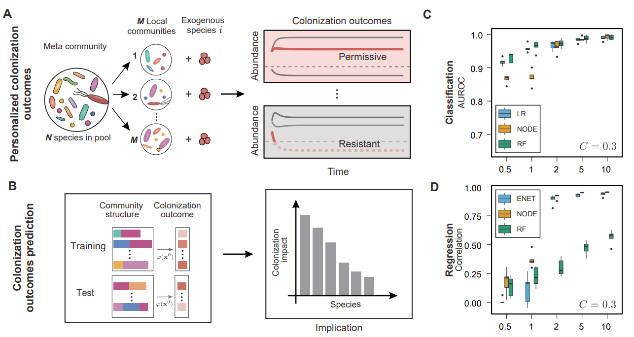 图1. 顺利获得采样不同物种组成的微生物群落作为训练数据,机器学习模型可以准确预测外源物种的定殖结果。