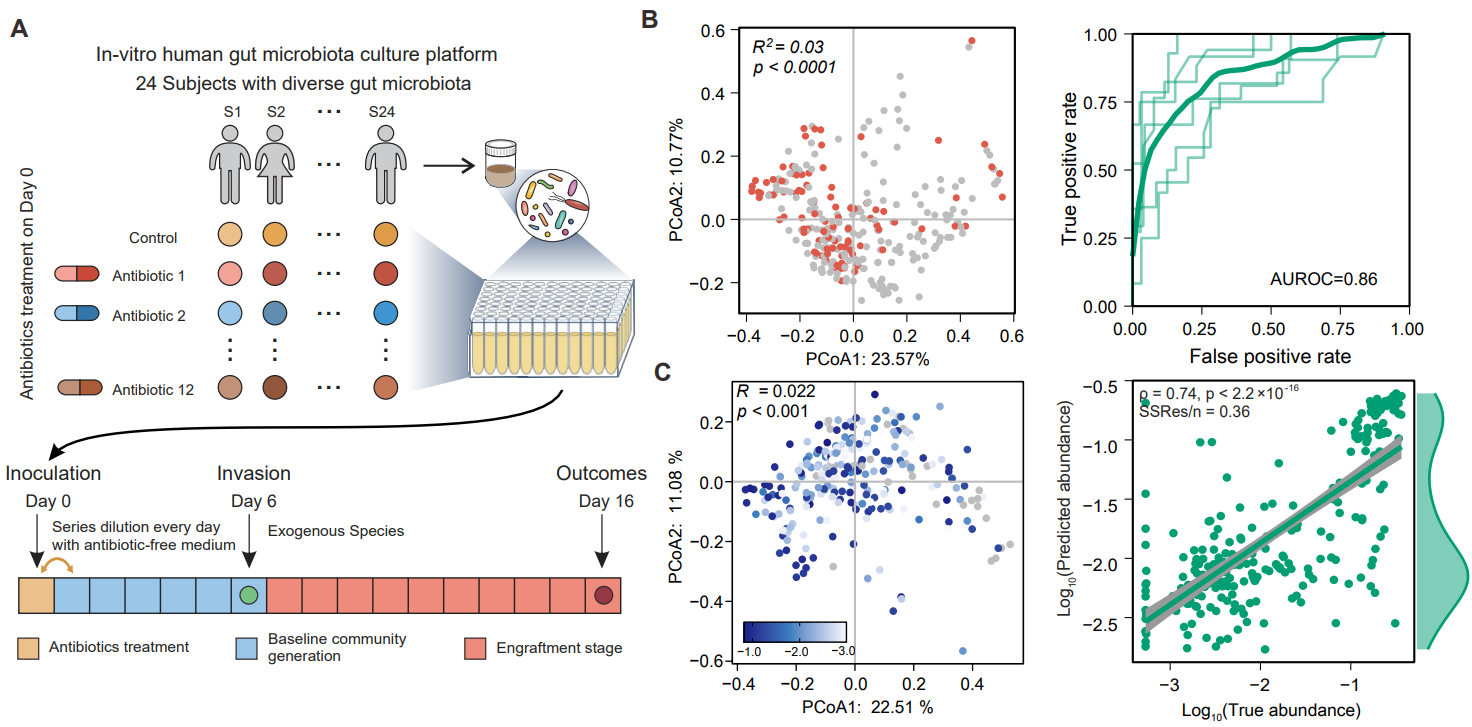 然后,在人体肠道微生物群落的体外培养体系中,研究团队用致病菌Enterococcus  faecium和益生菌Akkermansia  muciniphila作为代表性物种,在约300个不同物种组成的人体肠道微生物群落中进行了大规模的定殖实验(图2)。实验结果发现,外源物种的定殖结果在不同个体之间存在显著差异。在能够成功定殖的群落中,其稳定丰度也可能存在两个数量级以上的差别。此外,经过抗生素处理后,肠道菌群的物种多样性和定殖抗性显著降低,与之前的经验性观测和理论研究相吻合。对于两个不同物种的定殖实验数据集,机器学习模型均可以基于肠道菌群的初始物种组成来准确预测定殖结果。