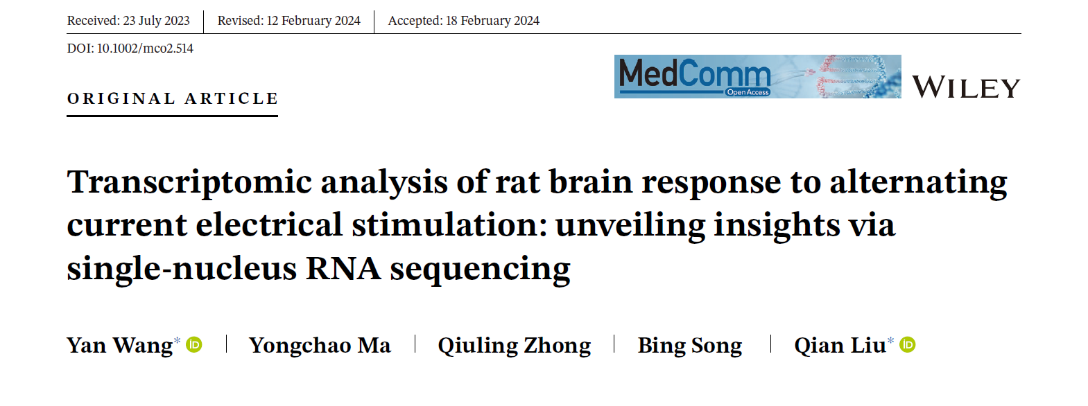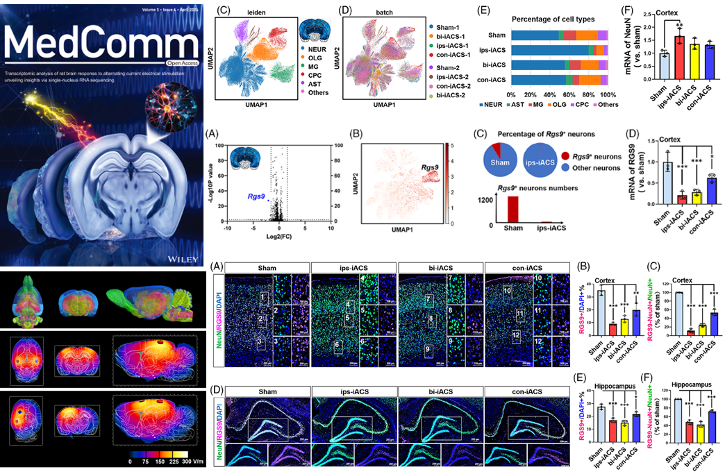 近期,中国科研实验室深圳先进技术研究院宋冰、王言、刘倩团队在MedComm (IF 9.9)上发表题为的“Transcriptomic analysis of rat brain response to alternating current electrical stimulation: unveiling insights via single-nucleus RNA sequencing”的封面文章,首次展示了伽马研讨电刺激在大鼠脑皮层、海马和丘脑的分脑区单细胞核转录组测序图谱(snRNA-seq)。该论文成果同时受到美国科学促进会(AAASEurekalert!新闻网站的关注和报道。