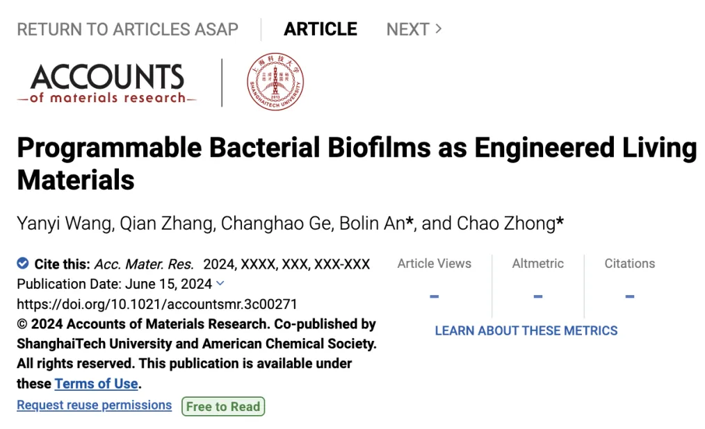 Accounts of Materials Research | 编程设计细菌生物被膜开展工程活材料