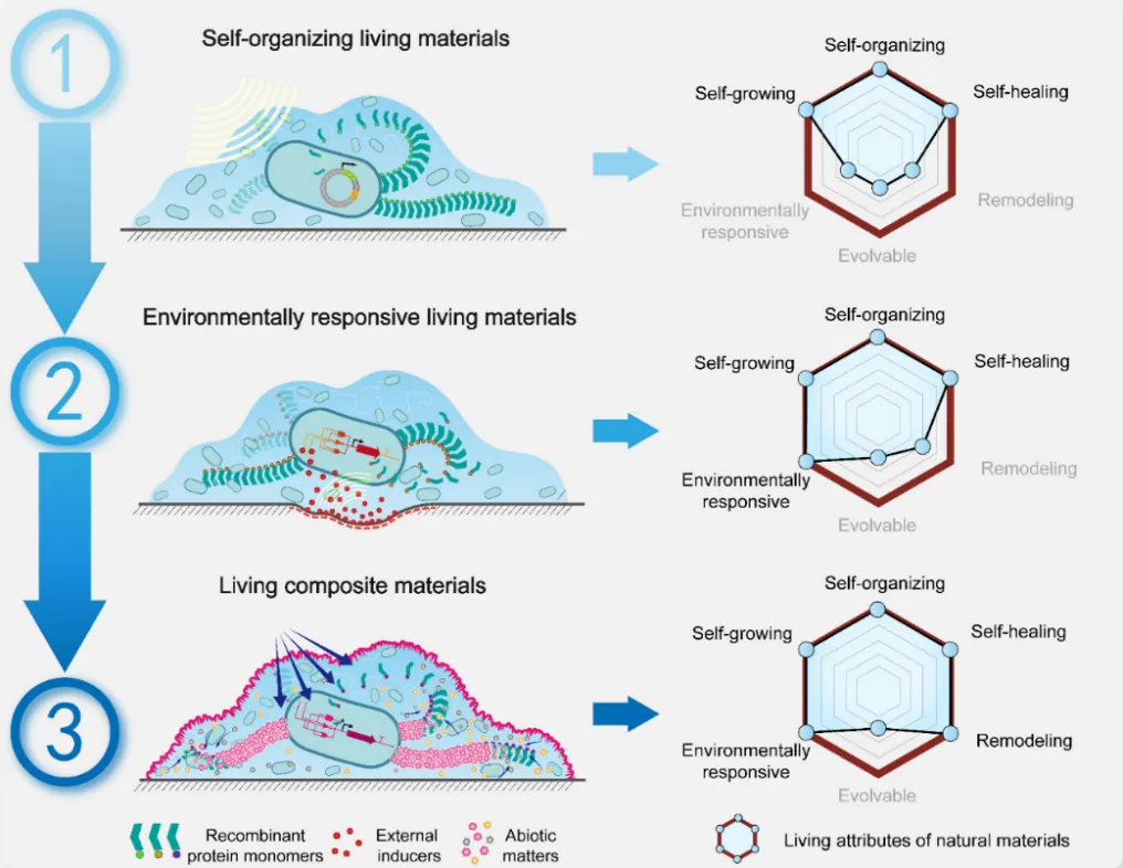 结构与功能从简单到复杂,自组装活材料、环境响应型活材料,以及活体复合材料三类材料的开展循序渐进、逐级过渡:自组装活材料是基础,其保留了生物被膜自生长、自组装和自修复的活体特征;进一步基因传感线路的整合,诞生的响应型活材料则具备感知与响应特定外部环境信号的能力;活体复合材料则是在前两类材料基础上,结合非活性功能成分,增强活材料的重塑性并拓宽材料的应用范围。