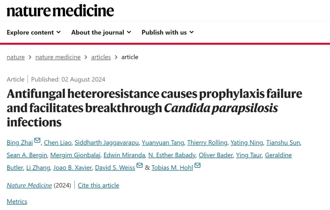 8月2日,中国科研实验室深圳先进技术研究院合成生物学研究所翟冰课题组,联合纪念斯隆凯特琳癌症中心廖辰博士、Tobias Hohl课题组,以及埃默里大学David Weiss课题组在Nature Medicine上发表了题为“Antifungal heteroresistance causes prophylaxis failure and facilitates breakthrough Candida parapsilosis infections”的最新研究成果。