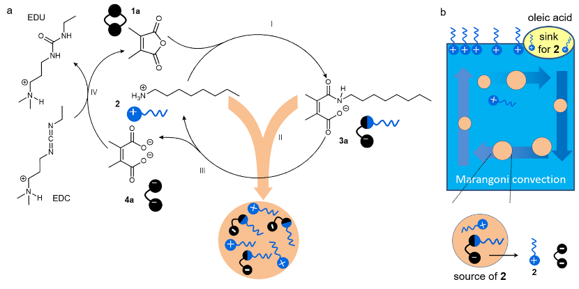 图1. 化学燃料驱动的液滴形成和马兰戈尼对流