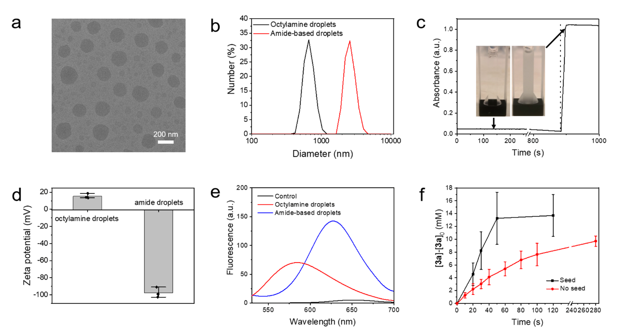 第一时间开发了一种耗散酰胺键,并构筑了活性液滴。马来酸酐和辛胺在水溶液中反应得到一种酰胺化合物,其在酸性条件下易于水解。碳二亚胺可作为第二种燃料分子,驱动二酸废料与辛胺重新生成酰胺化合物,从而构建耗散反应网络。在这一过程中,酰胺产物能够顺利获得分子间的静电和疏水作用与辛胺组装形成凝聚体液滴。这些液滴中的疏水区域有助于溶解马来酸酐,进而加速反应,实现自催化的生长。
