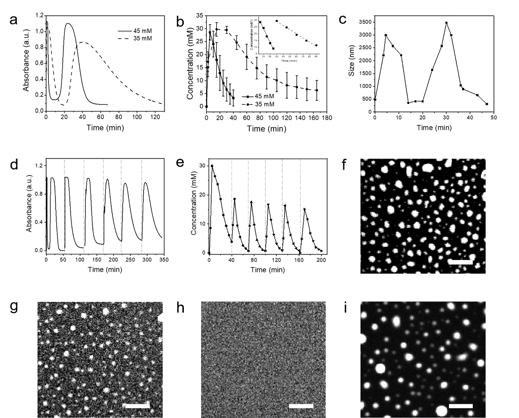 顺利获得控制化学燃料的添加,可以实现对液滴生长的动态调控。一方面,化学燃料能触发反应-组装网络中酰胺化合物与辛胺的浓度拮抗效应,促进液滴的震荡式生长;另一方面,当液滴完全水解消失后,加入化学燃料能够使其再生,这一循环可以重复多次,展现出瞬态结构的特征。