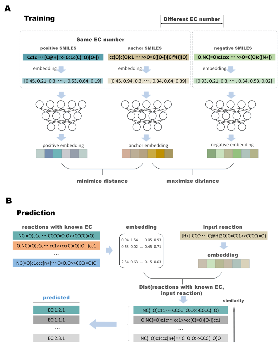 EC分类编号(EC number)是一套对酶催化功能进行系统分类的体系。EC分类编号不仅可以用来描述酶的功能,也可以对相应的酶促反应进行分类。虽然有经验的化学家可以手动分析一个酶促反应并对其EC分类编号的归类,但当面临庞大的待预测数据时,例如逆合成路径规划,药物代谢路径预测等,化学家们也会显得力不从心。此时,一个可靠的自动分类预测模型显得格外重要。