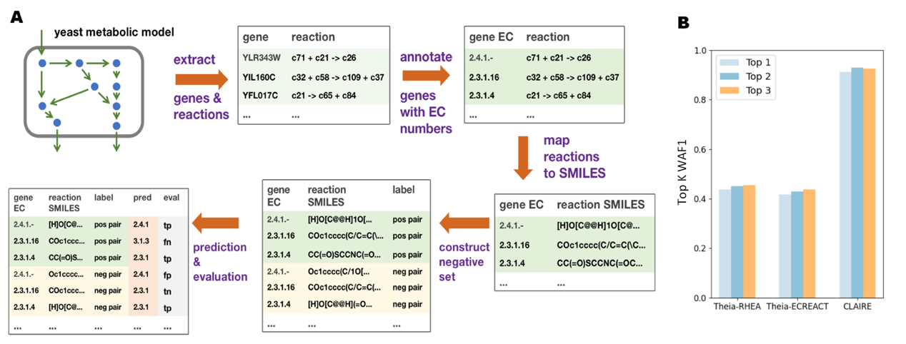 作者将CLAIRE与当前最领先的Theia模型进行了对比。Theia是2023年由瑞士洛桑联邦理工学院的科学家Daniel Probst发表在Journal of Cheminformatics期刊上的基于常规深度学习的模型——然而常规深度学习方法不能有效解决数据不平衡的问题。借助对比学习和数据扩增的策略,CLAIRE展现出了优异的性能——在测试集上,CLAIRE比Theia有数倍的准确率提升,且在三级EC分类编号预测之间的一致性也显著高于Theia。此外,作者利用酵母菌的代谢模型构建了另一个大型独立测试集。在该数据集中,CLAIRE的表现也显著高于Theia。