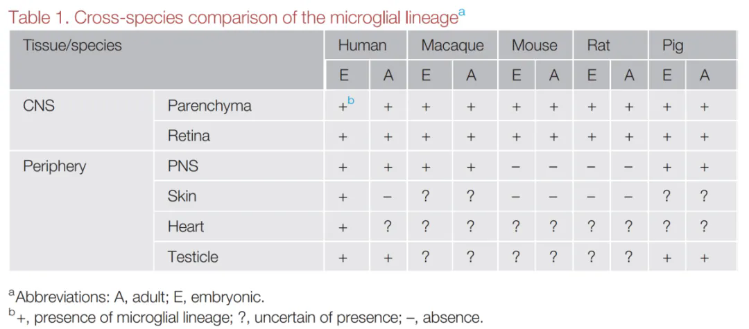 尽管Pío del Río-Hortega的早期研究聚焦于CNS,但其染色技术主要针对神经组织,限制了对外周区域的探索。后续啮齿类动物研究(小鼠和大鼠)强化了“小胶质细胞仅存于CNS”的观点。然而,近期单细胞基因组学研究在人类及非啮齿类外周组织中发现了与小胶质细胞具有相同分子特征及卵黄囊起源的细胞(Table 1)。这些发现挑战了传统认知,表明小胶质细胞谱系是一类分布广泛且具有器官特异性功能的独特免疫谱系(图1B)。