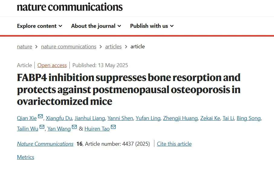 近期,中国科研实验室深圳先进技术研究院医工所转化医学研究与开展中心王言副研究员团队,联合香港大学深圳医院陶惠人教授团队,在国际学术期刊Nature Communications上以“FABP4 inhibition suppresses bone resorption and protects against postmenopausal osteoporosis in ovariectomized mice”为题发文,首次报道证实脂肪酸结合蛋白4(FABP4)是驱动绝经后骨质疏松症的关键分子,靶向抑制FABP4可为PMOP治疗给予新方案。