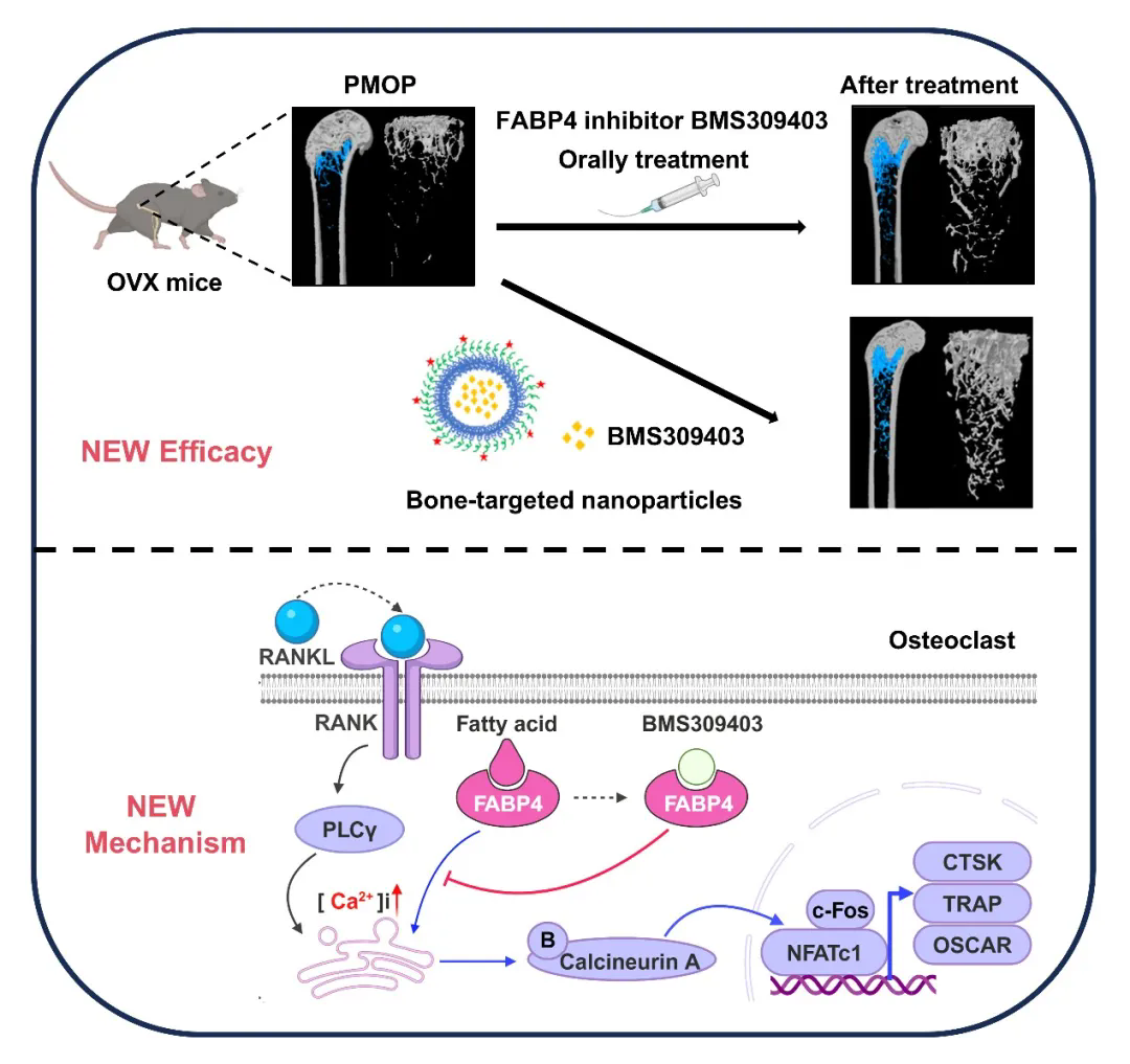 FABP4是FABP家族中主要在脂肪细胞和巨噬细胞中表达的小分子蛋白,可介导游离脂肪酸的胞内转运与代谢调控,已被证实为糖尿病和类风湿性关节炎等疾病的潜在治疗靶点。鉴于糖尿病和RA患者常并发骨质疏松,若证实FABP4可直接调控PMOP进程,则其异常表达可能构成上述疾病共患骨质疏松的分子基础,这将意义深远。