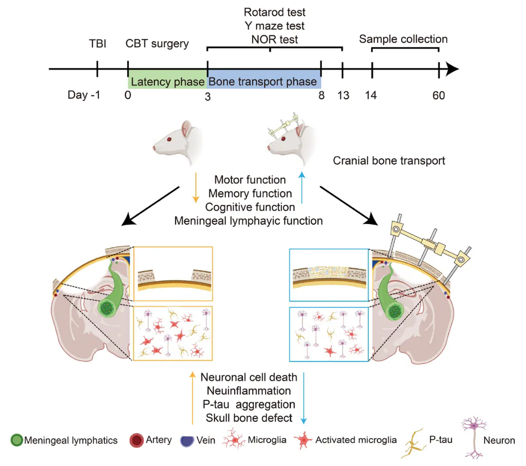 颅骨搬移术(Cranial bone transport, CBT)是一种基于Ilizarov牵拉成组织技术理论上衍生的外固定技术,持续牵拉断裂骨组织的机械传导不仅能促进骨骼再生,还可诱导微小血管、神经等多种组织的再生。现在研究发现颅骨和脑膜之间存在微小的连接通道,颅骨骨髓中的免疫细胞可顺利获得这些通道快速迁移至脑膜,参与炎症或损伤修复。本研究团队前期研究中已经证明CBT顺利获得改善血管生成、神经生成和脑膜淋巴功能来促进缺血性卒中大鼠模型(大脑中动脉闭塞)的神经功能恢复,此外还发现CBT能够显著促进脑膜淋巴管的再生,并增强其引流功能,从而改善阿尔茨海默病转基因小鼠(5xFAD)的认知能力,减少脑内淀粉样蛋白沉积,并有效缓解神经炎症 。