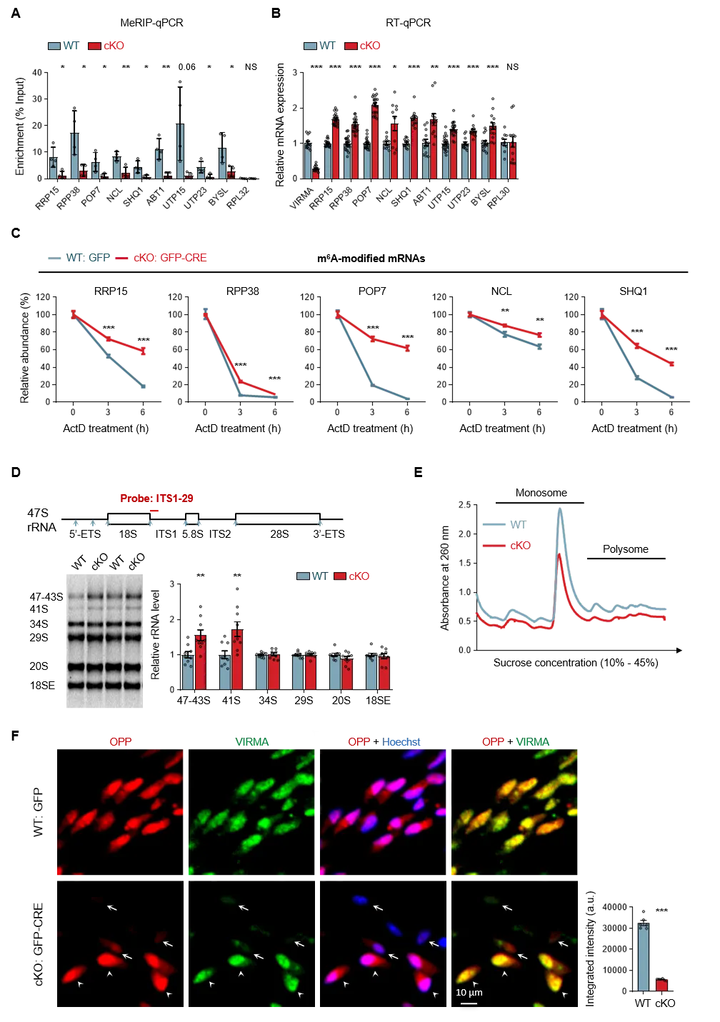 图2. VIRMA缺失顺利获得延长核糖体生成关键因子mRNA半衰期引发核糖体生成缺陷与全局蛋白翻译抑制