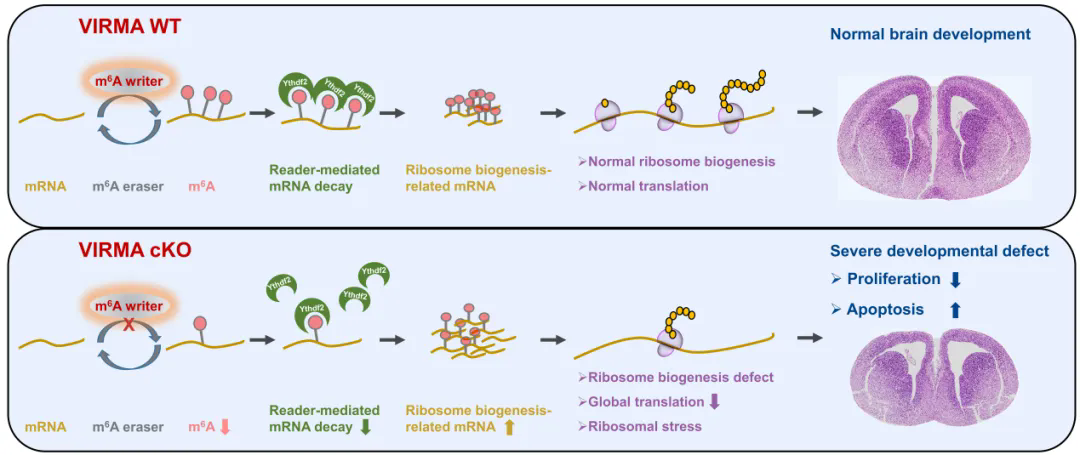 图4. VIRMA介导的m6A修饰调控核糖体生成通路参与大脑发育的分子机制示意图