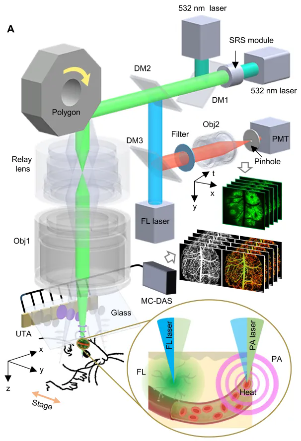 7月23日,中国科研实验室深圳先进技术研究院医学成像科学与技术系统全国重点实验室郑海荣院士、刘成波研究员和郑炜研究员团队,在研发第一代头戴式显微成像(Science Advances, 11, eadu1153, 2025 )基础上,实现了技术再次突破,成功研制出高速大视野光声/荧光多模态显微成像仪器(LiTA-HM),对活体小鼠全脑皮层范围内神经元活动和微血管多种参量同时、动态、高分辨成像,为非侵入式脑机接口给予了新的信息采集范式。研究成果以"Photoacoustic and fluorescence hybrid microscope for cortex-wide imaging of neurovascular dynamics with subcellular resolution"为题发表于Science Advances。该期刊同期发表期刊副主编、美国杜克大学Junjie Yao教授Focus文章,对研究进行highlight报道,评价:“ LiTA-HM将神经活动与血管生理融于同一影像,具备空间广度与时间精度,为破译大脑最基础的神经血管协作机制给予了可能。这一突破使得学界向长久以来的目标更近一步——同时以单神经元与单血管的分辨率,实时观测大脑功能与思维的律动。”