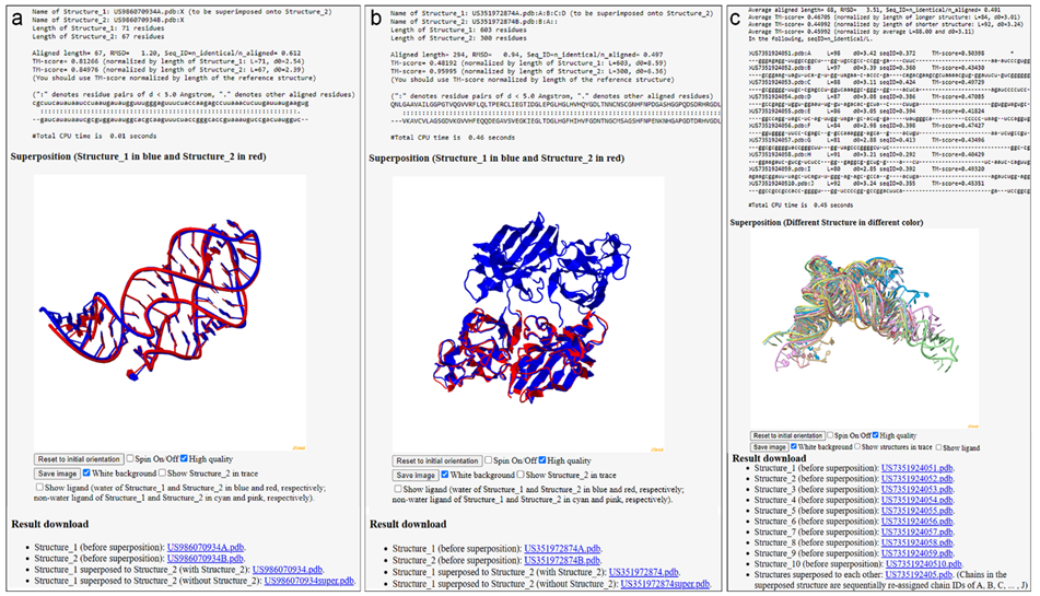图3. 顺利获得网页服务器执行US-align比对任务的网页输出。a, 单体RNA结构的两两比对。b, 蛋白复合物的两两比对。c, RNA的多结构比对。