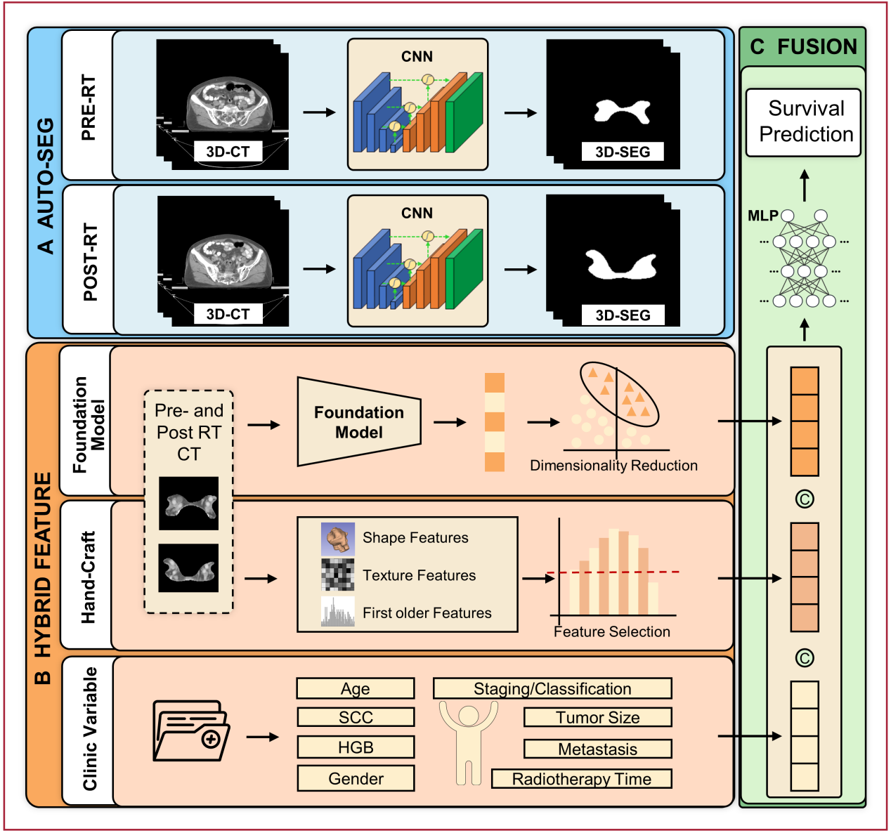 研究团队提出了一种融合放疗前后CT基础模型特征、影像组学特征与临床信息的多模态深度学习预后预测方法(图2)。该方法第一时间采用基于深度学习的自动分割技术精准提取肿瘤区域,随后利用预训练CT基础模型提取高维深度特征,并顺利获得主成分分析降维和特征筛选技术,实现多源异构数据的智能融合。
