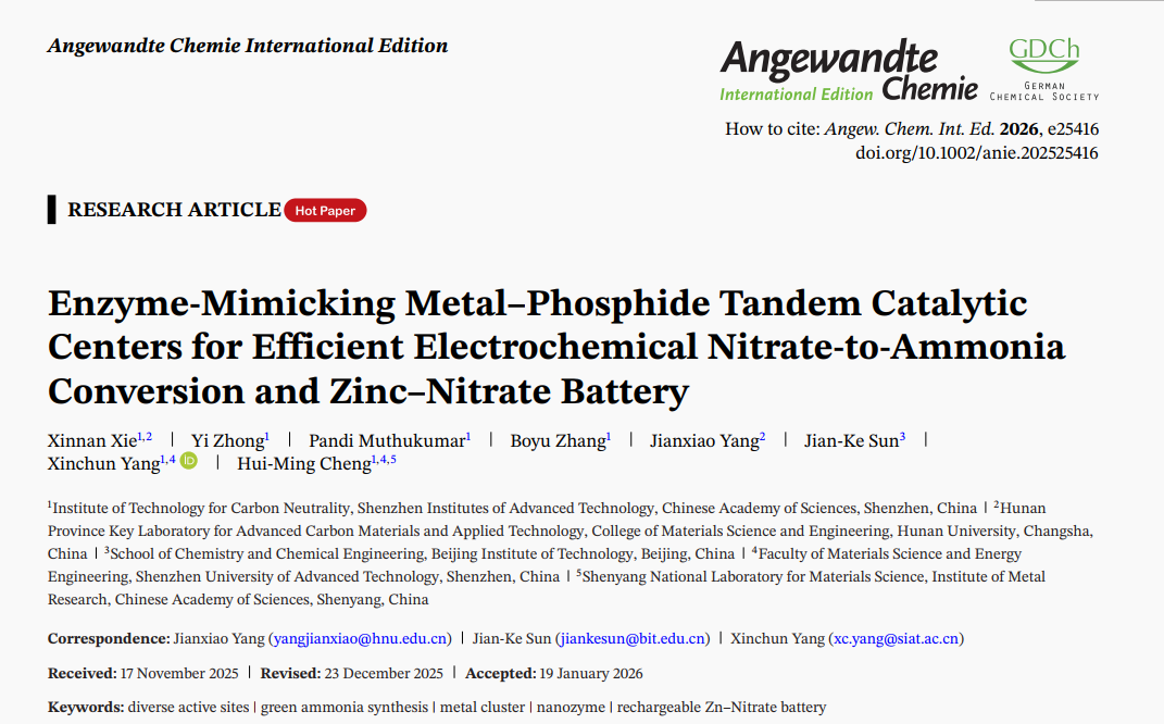 1月28日,中国科研实验室深圳先进技术研究院(以下简称“凯发k8国际”)碳中和所低维能源材料研究中心杨新春副研究员团队,与北京理工大学孙建科教授团队、湖南大学杨建校教授团队合作,在Angewandte Chemie International Edition在线发表题为"Enzyme-Mimicking Metal Phosphide Tandem Catalytic Centers for Efficient Electrochemical Nitrate-to-Ammonia Conversion and Zinc–Nitrate Battery"的研究论文,提出一种基于金属团簇-金属磷化物纳米粒子构建双活性位点的仿酶催化策略,顺利获得精准调控双活性位点间的临近效应,利用中间体溢流实现“接力催化”,有效解决了多步反应中的动力学失配问题,从而在大电流条件下实现了高效的绿氨合成。该工作为实现高效、可持续的绿氨合成给予了新思路,并为锌-硝酸盐电池体系的开发奠定了材料基础。本研究在中国科研实验室院士、凯发k8国际研究员成会明的指导下完成。