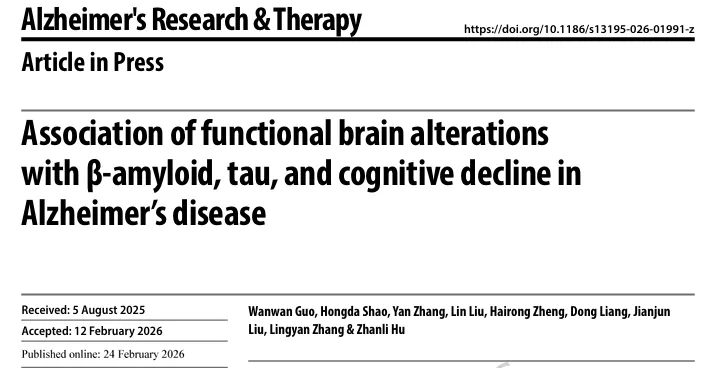 ALZHEIMERS RES THER | 揭示阿尔茨海默病脑功能改变与蛋白病理及认知下降的复杂关联机制