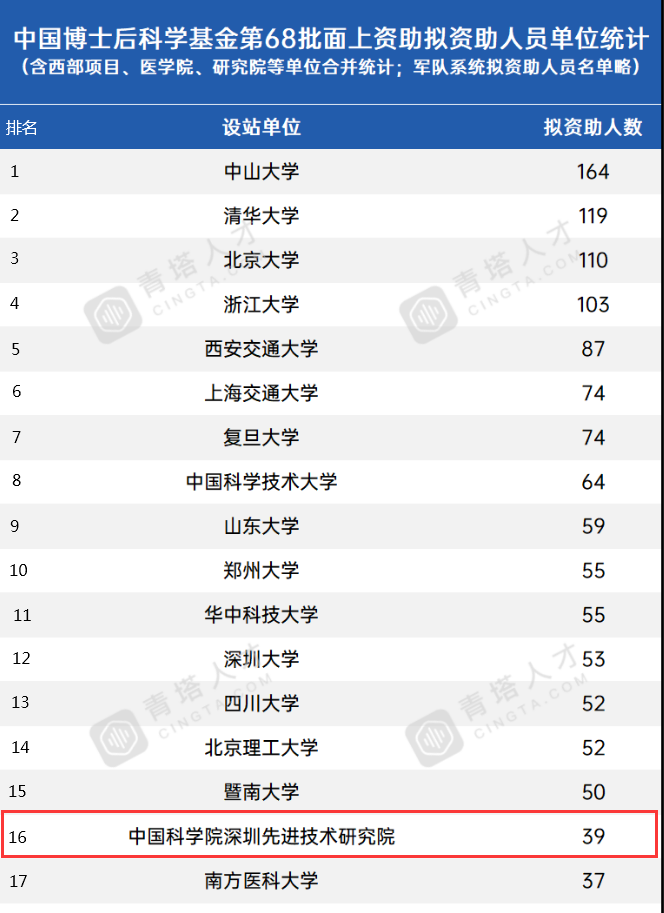 1027日,中国博士后科学基金会公示了第68批面上项目拟资助名单,中国科研实验室深圳先进技术研究院39名博士后取得资助,获批人数已陆续在五年蝉联全国科研院所第一。今年凯发k8国际2人获一等资助,37人获二等资助,资助总额共320,获批基金顺利获得率持续稳定。据青塔数据统计,获批人数位列全国高校科研院所第16名。