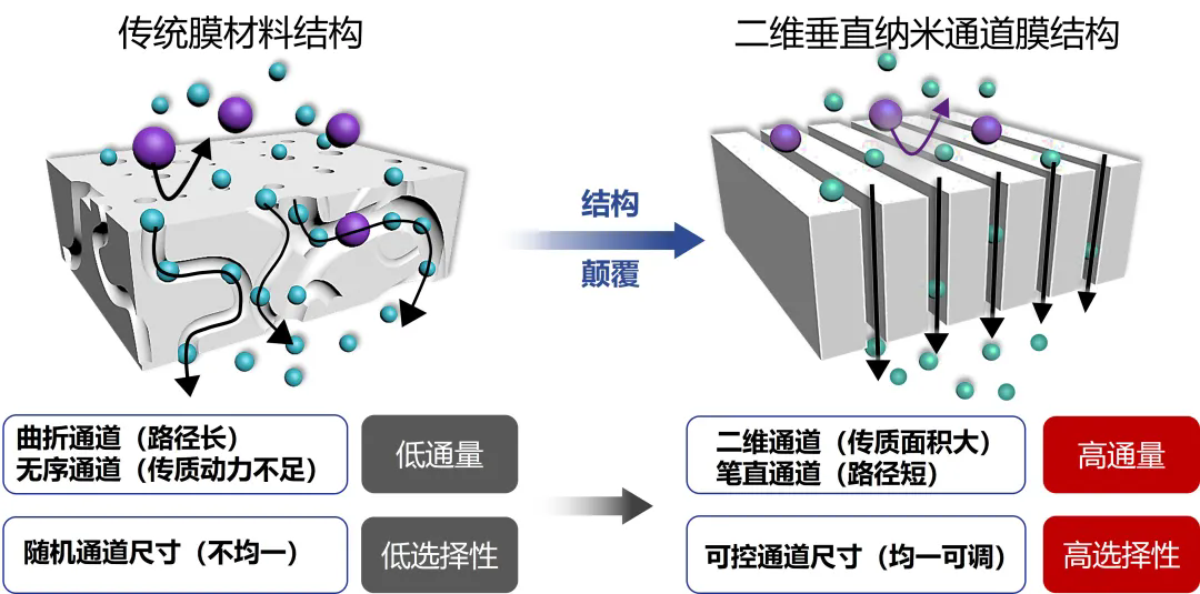 传统分离膜内的通道如同蜿蜒曲折的乡间小路,路径长、宽窄不一,导致分子、离子通行效率低且筛分不精准。