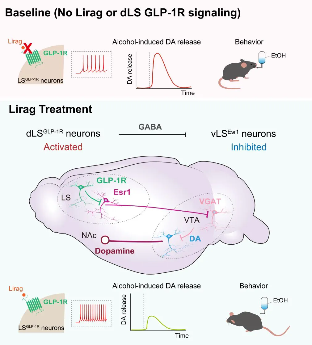 酒精使用障碍(俗称“酒精成瘾”)是一种慢性且易复发的脑疾病,现在临床上缺乏有效的精准治疗方法,对个体健康和社会公共卫生构成长期挑战。此前已有临床小样本研究发现,GLP-1 类药物可能降低饮酒行为,现在已有以司美格鲁肽为代表的GLP-1类药物召开针对酒精使用障碍的大规模临床研究。但GLP-1类药物究竟如何在大脑中调控酒精带来的愉悦感,从而减少饮酒冲动,不断缺乏清晰的神经机制解释。